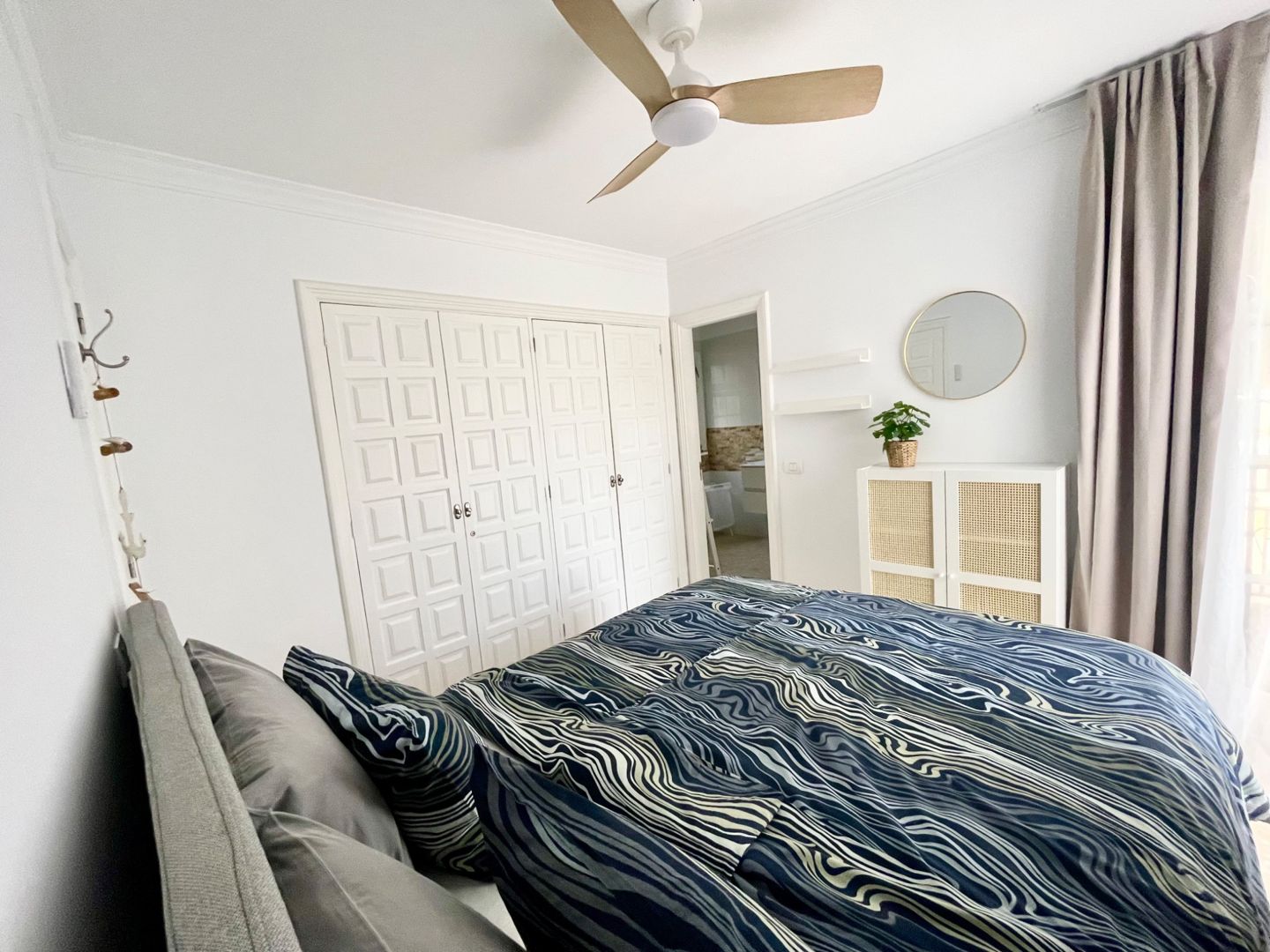2 ložnice orientované na jihovýchod (2× manželská postel) s vestavěnými skříněmi a stropními větráky